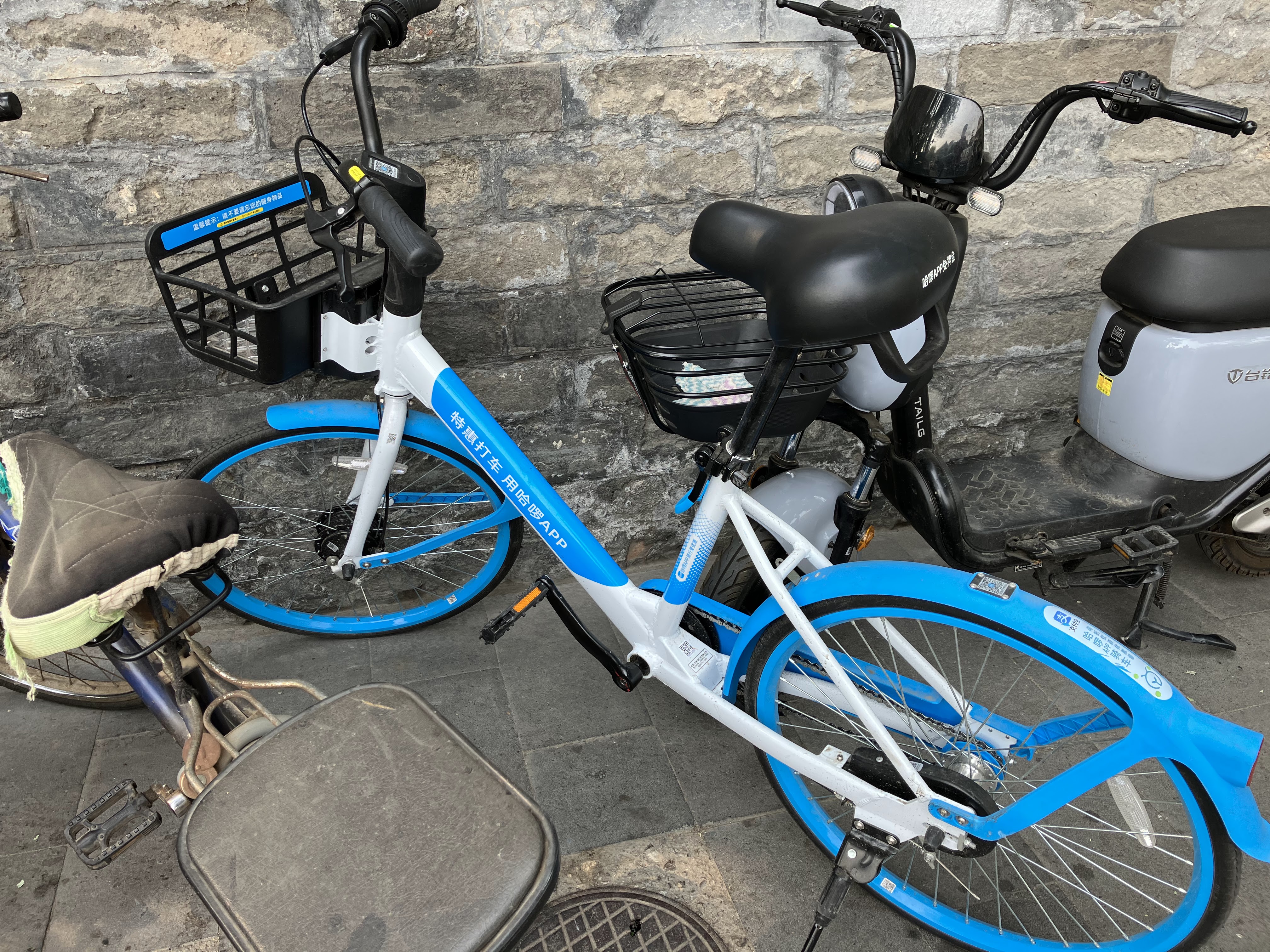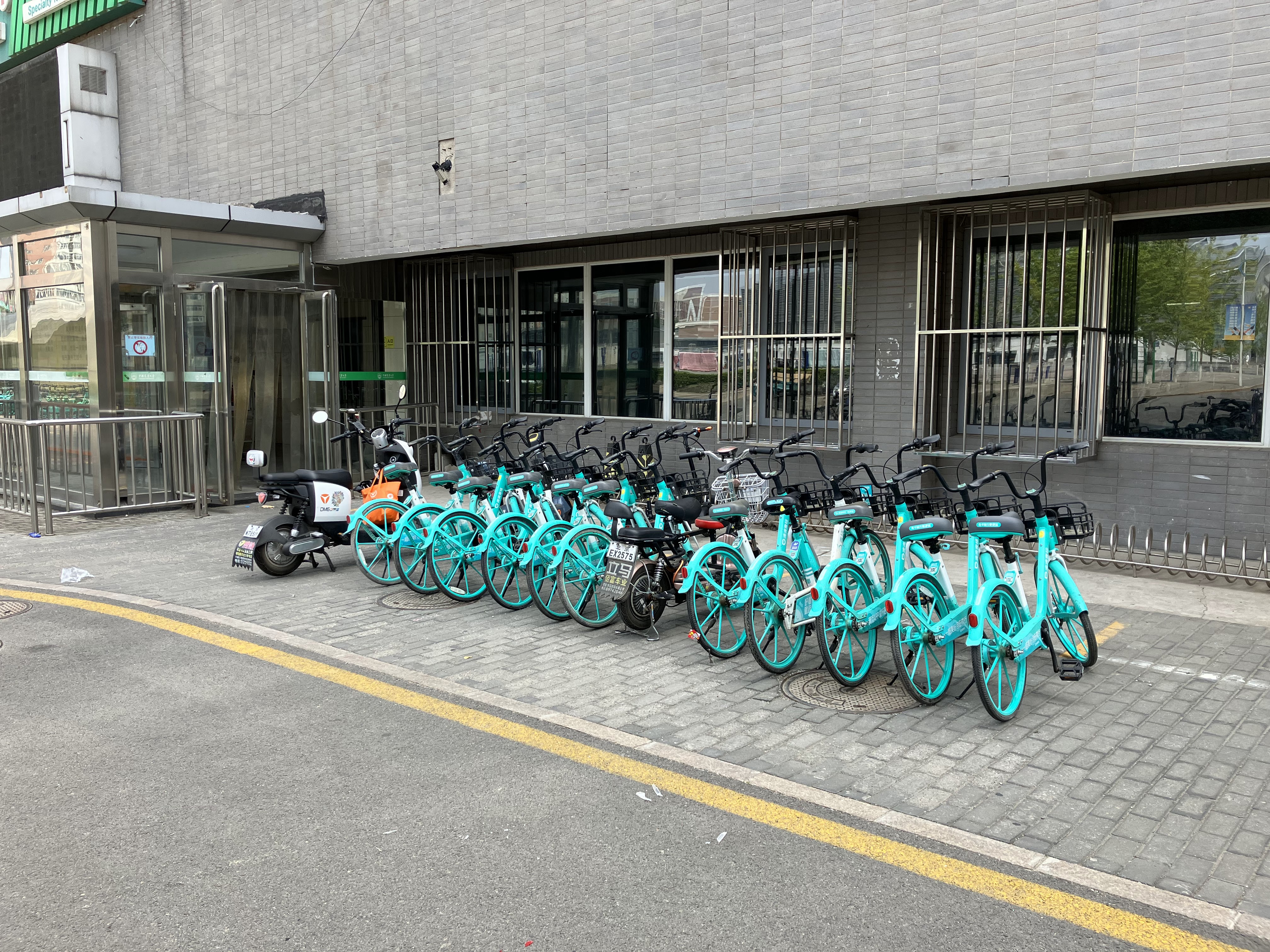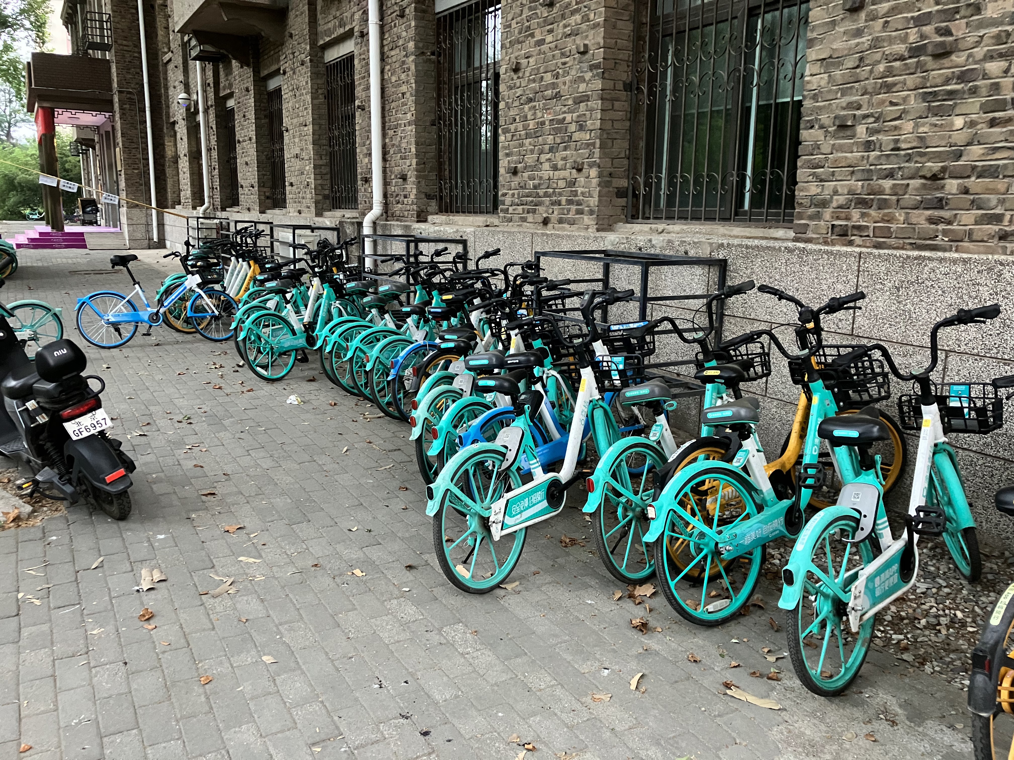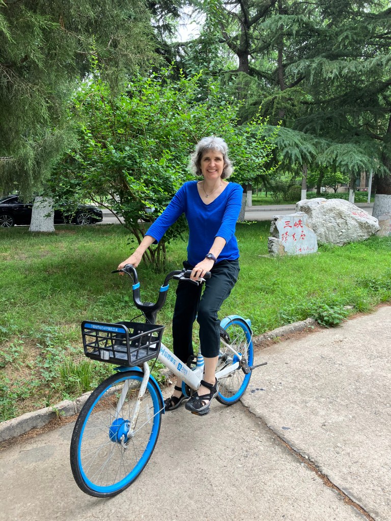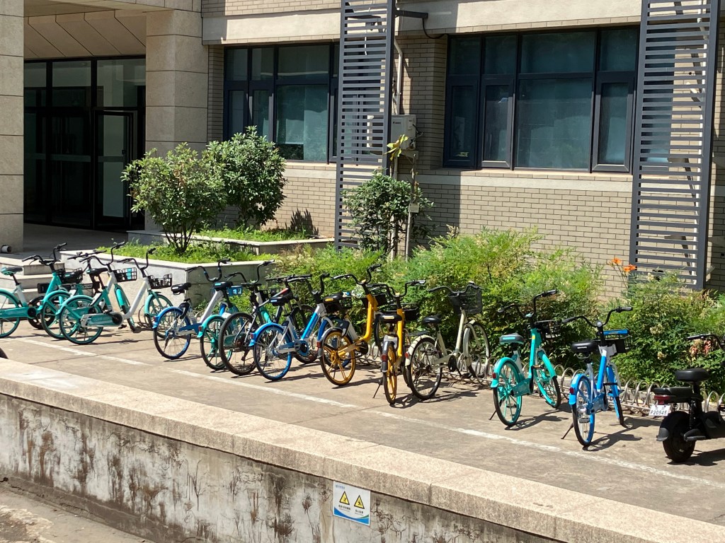 I am becoming a connoisseur of bike share bikes! When it’s time for me to go for a ride, I peruse all the spots where they are parked. As you can see, they are lined up in many different places. They come in three different colors: turquoise, yellow and blue. The color signifies which digital payment system you can use to rent them. The turquoise and yellow ones can be rented with WeChat only, which I don’t have. The blue ones are rentable with Alipay, which I do have. So I can only ride on the blue ones. The blue bikes are also the most rare, so I sometimes have to go hunting for one.