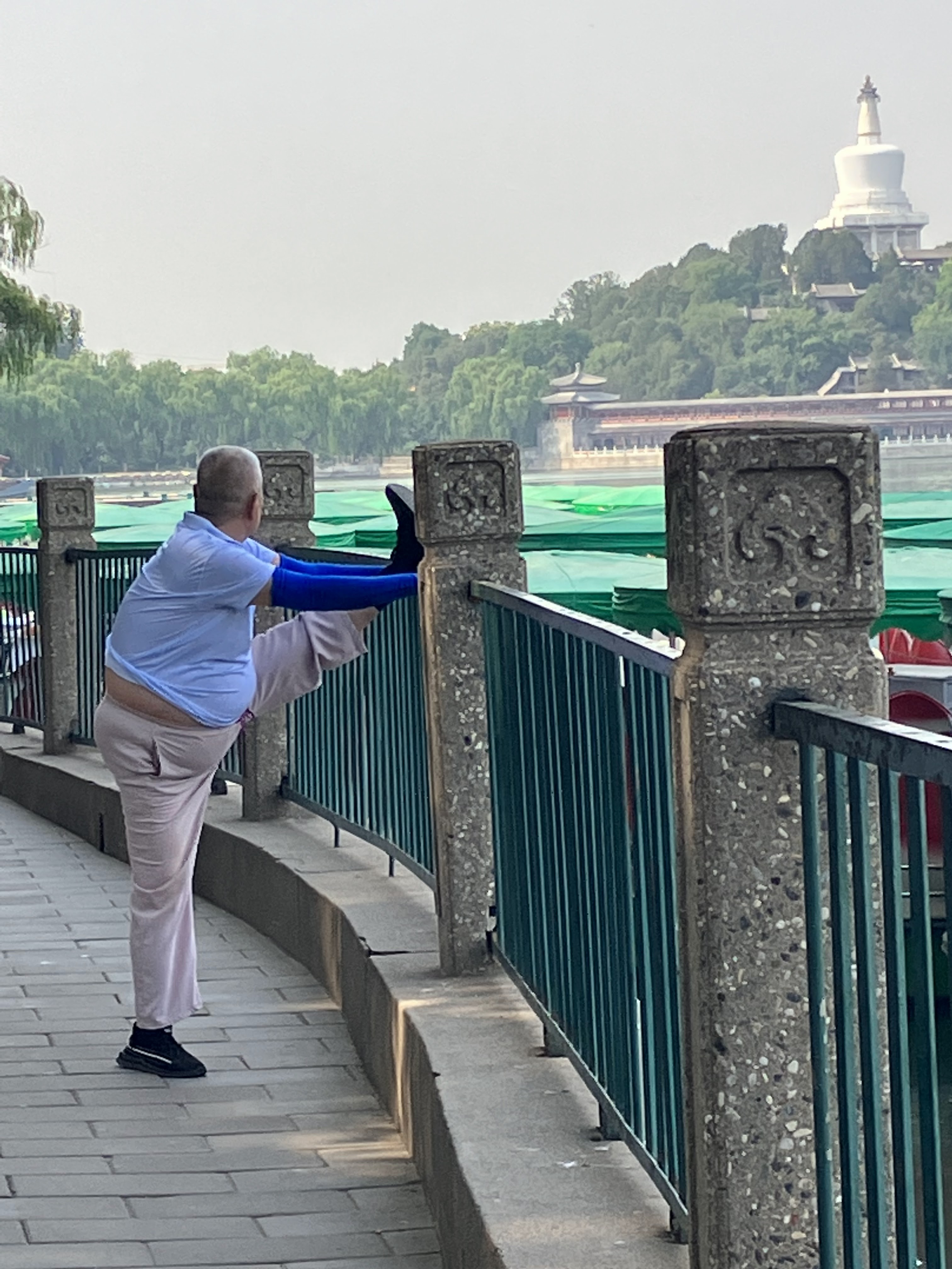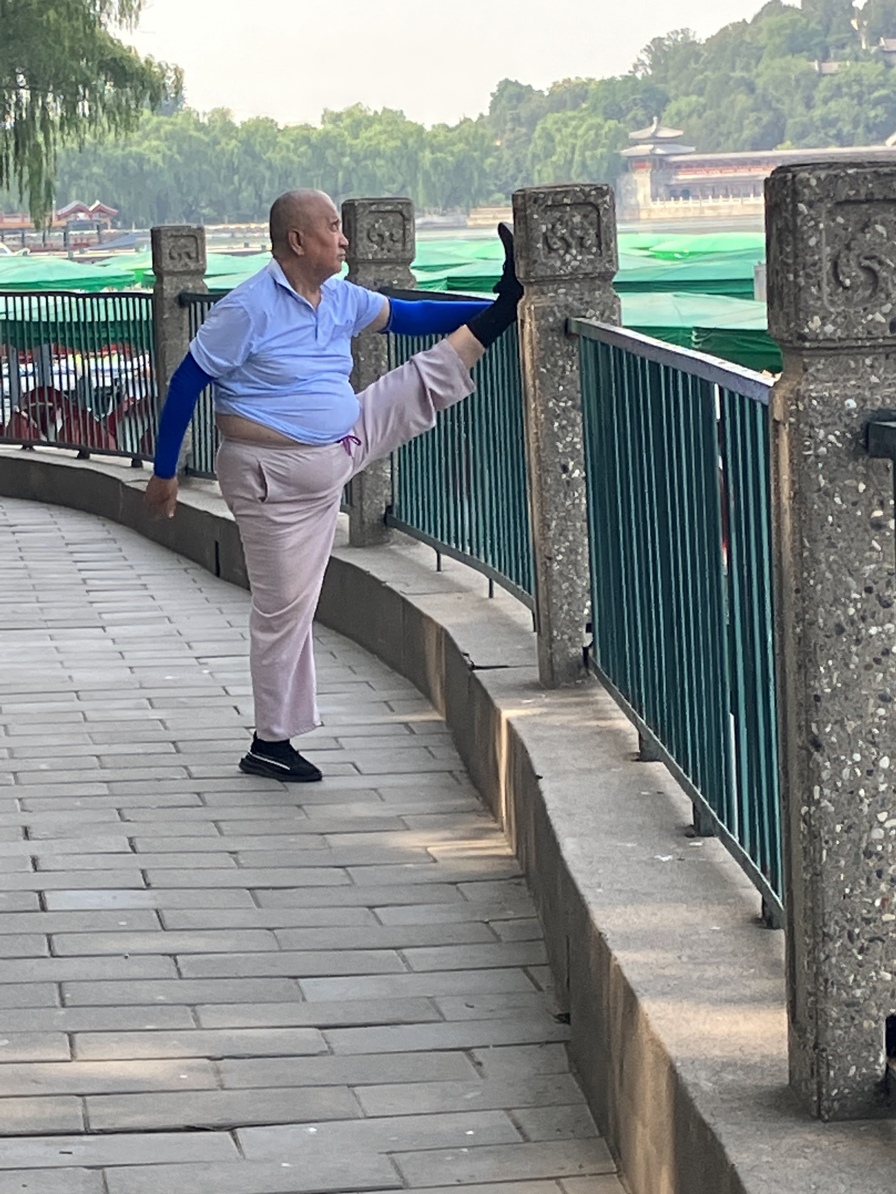 –> A man stretching — not just any man, an old man. Stretching in public is very common among the Chinese, especially the seniors. They like to stretch their hamstrings. On fences and gates and benches and walls and railings. It’s a regular thing here. I couldn’t get into that position if I tried. I can’t even touch my own toes, let alone put my foot up at shoulder height. It’s ludicrous that he can do that. And, more amazingly, it’s perfectly normal to do out in a public park.