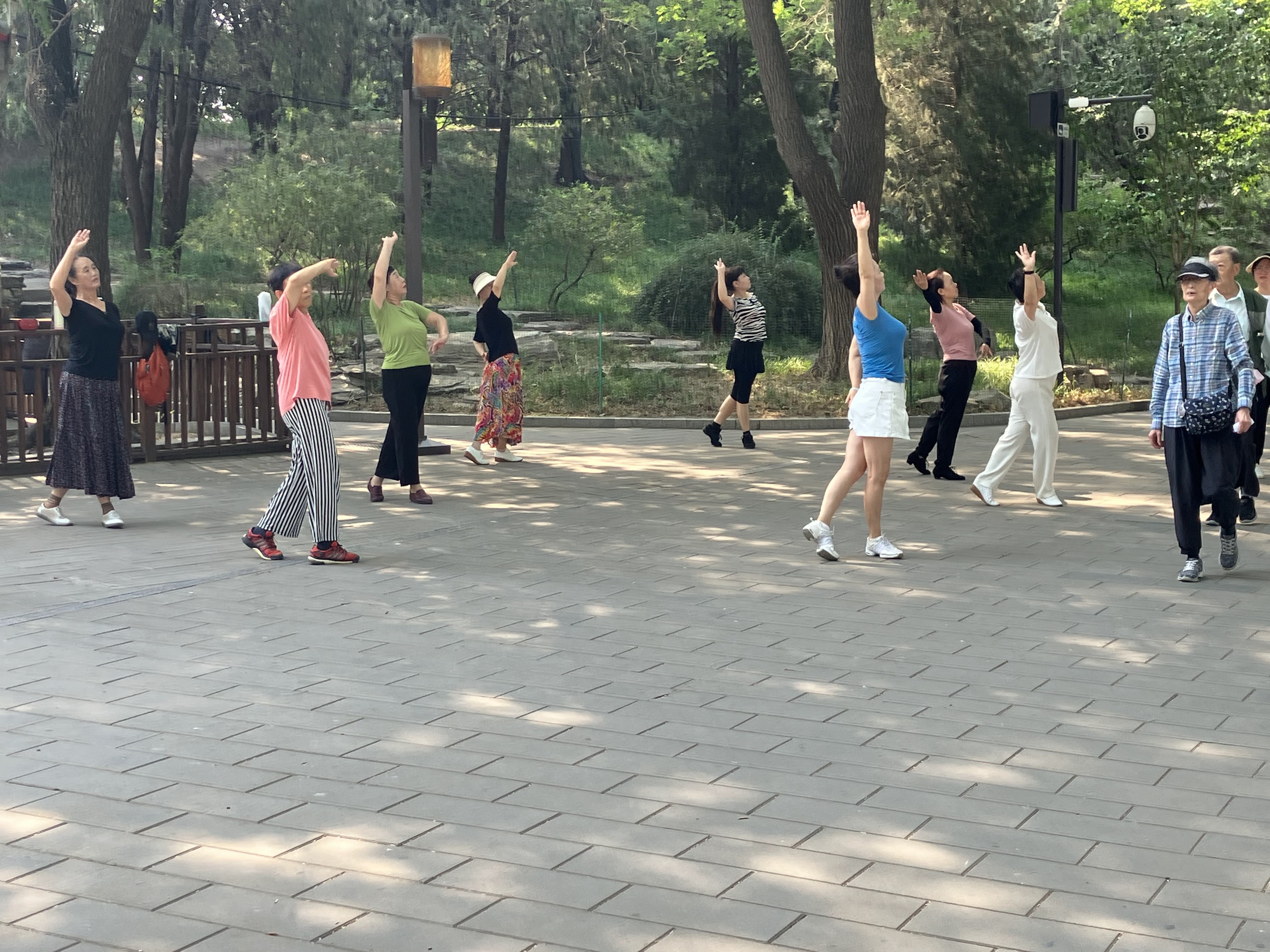 –> A group of women dancing tradition Chinese dance, just to the side of one path in the shade of the trees. It was lovely to watch.