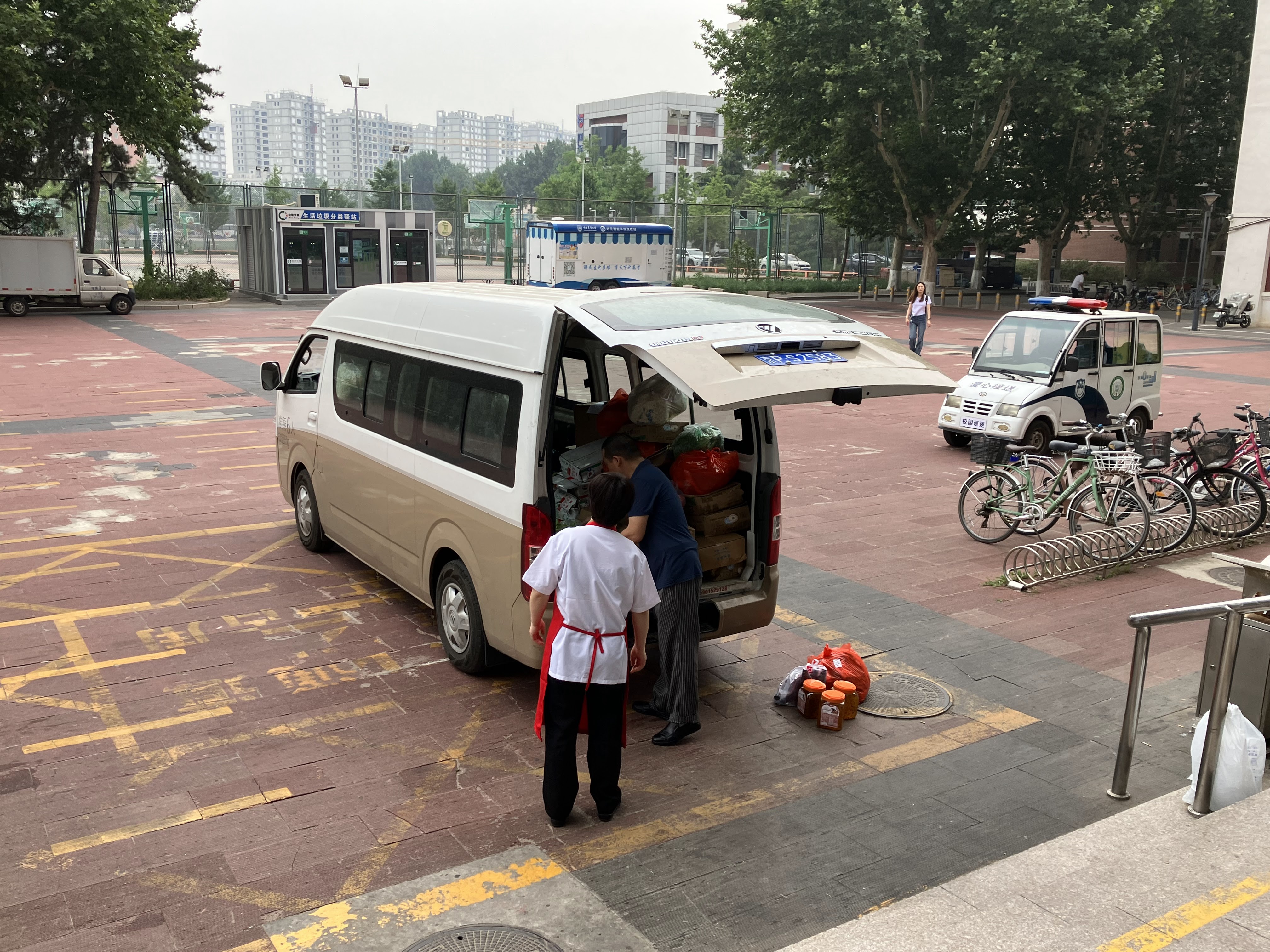 Then I saw the delivery truck delivering vegetables to one of the major dining halls on campus — a dining hall that serves at least 5000 meals per day. Note the sacks of fresh veggies being unloaded from an old VW bus, onto an ancient had cart up a set of 8 stair steps. Very curious.